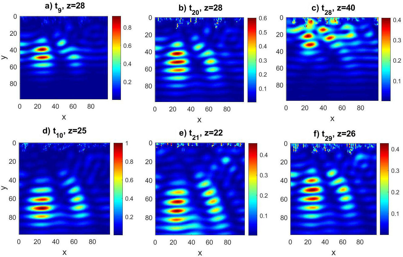 Figure 3 shows the distribution of the |E x | field in some times for the results shown in Fig. 2. In Fig. 3, we can see some circles with a field width localized for different times. Here z represents one of the 3D system planes for a better viewing. We want to note that there is no single time for which we can find a localized field, but in the vicinity of the maximum (IPR) ∼ 0.5, the probability of finding high amplitude modes is very close to one, as we show below.