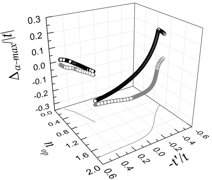 FIGURE 2 Superconducting gap amplitudes ∆ a,max , for α = s (open gray circles) and α = s * (open black circles) evaluated at the optimal carrier concentration or doping n op(t’) considering the same set of parameters as in Fig. 1.
