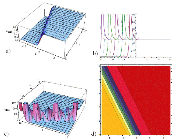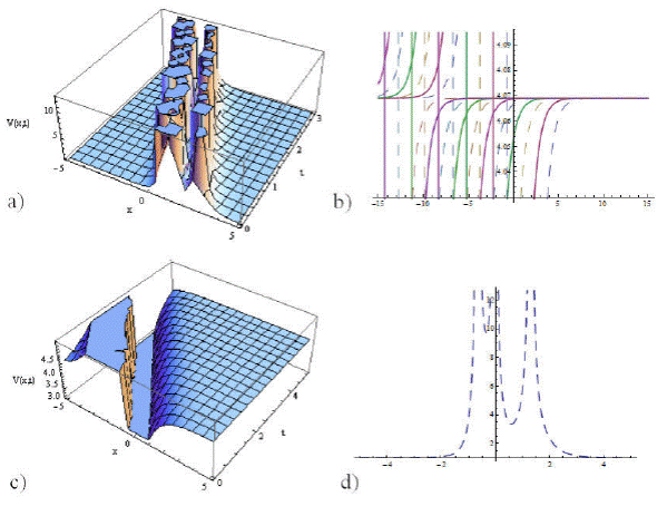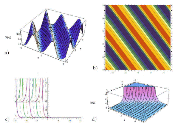 Figure 1 The graphs plotting of (23) and (24) is given. Here fig. a) is 3rd-dimensional graph of (23) as a periodic type soliton with associated values of parameters ξ0 = −3, 𝜖 = 1.9, a = −2,µ1 = −2, µ2 = −1.8, b = −1.6, c = −1.1, µ3 = 1.9 in intervals (0,5), (-5,5). And b) shows contour plotting of (23) considering all those parametric values used above in intervals (-5,5), (0,5). And c) represents the two-dimensional graph of (24) as semi half-bright type soliton using intervals (0,10), (-15,15). And d) represents 3rd- dimensional plotting of (24) with parametric values ξ0 = 1.8, 𝜖 = −1.8, µ1 = 3.0, µ2 = 1.8, a = 2.1, b = 1.6, c = 1.1, µ3 = −1.9 with in intervals (0,5), (-5,5).