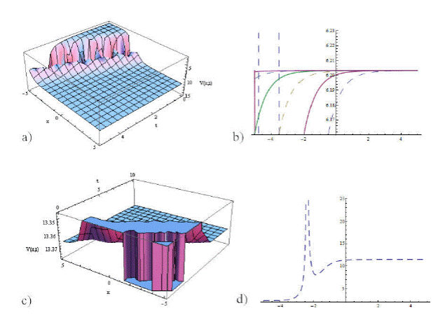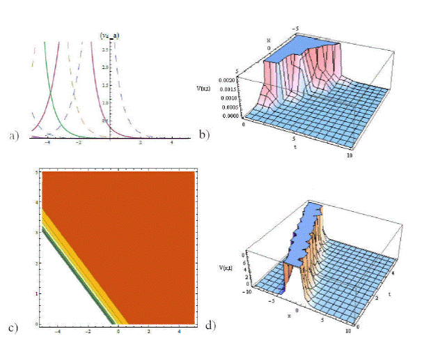 Figure 3 The physical representation of (31), and (32) has been given. Here a) visualizes the graphical figure of (31) as half doubly bright type soliton with ξ0 = −1.8, 𝜖 = −1.7, a = 2.9,µ1 = 1.6, µ2 = 1.9, b = −1.6, c = 1.1, µ3 = 1.988 in intervals (0,3), (-5,5). And b) shows 2nd-dimensional plotting of (32) as bright- dark (combined) soliton in intervals (0,10), (-15,15). And c) represents 3rd-dimensional plotting of (32) with ξ0 = 1.9, 𝜖 = −1.8, µ1 = 1.7, µ2 = −1.98, a = 2.1, b = 1.9, c = −1.98, µ3 = 2.8 in intervals (0,5), (-5,5). While d)shows the one dimensional graph of (31) considering all those parametric values used above in interval (-5,5).