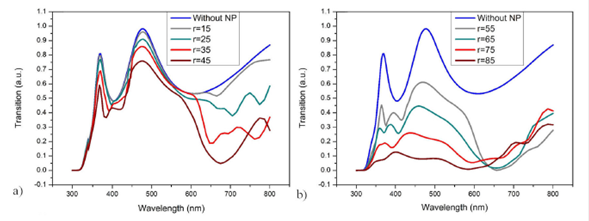Figure 1 shows the effect of the size of GNPs on the reflection spectra of embedded GNP@TiO2 thin films with star shapes. Here, r represents the radius of the GNPs. It is clear from the figure that NPs of different sizes have different effects on the TiO2 reflection spectra.