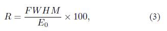 The energy resolution of a detector system is obtained from the peak full width at one-half of the maximum height (FWHM) of a single peak using the following equation: