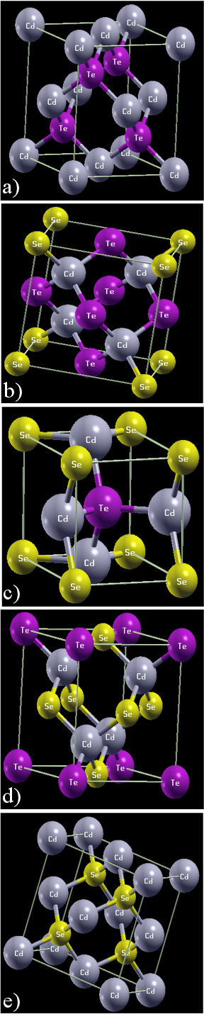 FIGURE 1 A geometry of the studied ternary alloys CdSe x Te 1−x : a): x = 0, b): x = 0.25, c) x = 0.50, d) x = 0.75, e) x = 1). The atoms of Cd are with silver color, the Se atoms are with gold color while the Te atoms are with magenta color.