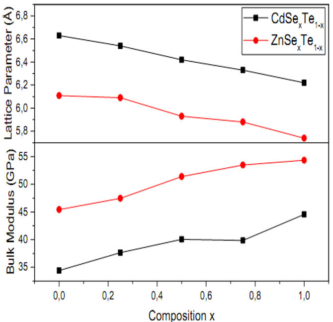 On the other hand, for the bulk modulus, a visible deviation from Vegard’s law from the linear concentration dependence was observed exhibiting downward boing to the order 0.66 GPa and 4.82 GPa for CdSe x Te 1−x and ZnSe x Te 1−x respectively. This deviation is mainly owing to the mismatch of the bulk modulus of the corresponding terminal binary compounds.