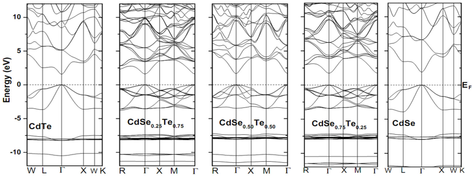 The calculations of the band structures of the specimens under each of CdSe x Te 1−x and ZnSe x Te 1−x systems were performed at the optimized lattice constants using the mBJ scheme. Therefore, the band structures of the five specimens under the CdSe x Te 1−x (x =0,0.25,0.50,0.75,1) ternary alloys are represented in Fig. 3 (as a prototype). It is obvious that the valence band maximum (VBM) and conduction band minimum (CBM) lie at the Γ-symmetry point resulting in the direct (Γ−Γ) bandgap in the zinc blende phase. It is also observed that the qualitative features of band structures of each of the said ternary alloys are almost same at any specific (Se) concentration x.