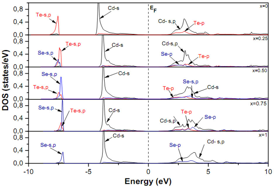 It can be seen from Fig. 5 that the TDOS comprises three distinguished regions: the lower valence band (LVB), upper valence band (UVB) and the conduction band (CB), respectively. The Fermi energy level E F in all the PDOS plots is set to origin and shown by dotted line. Besides, one can observe that the different regions of the valence and conduction bands are dominated by various orbitals of the Cd, Se and Te atoms. Then, the contribution of the two-chalcogenide orbitals results from the combined contribution of Se and Te atoms. Additionally, the contribution from different orbitals of Selenium atoms progressively increases while those of Tellurium atoms gradually decrease with increasing Selenium concentration. The lower conduction band has a mixed character of p states of Cd, Se and Te.