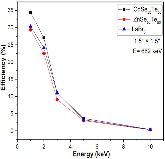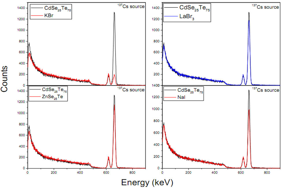 The detection efficiencies were obtained using Eqs. (1) and (2) for each gamma ray energyemitted by the 22Na, 60Co, and 137Cs radioactive isotopes. We have reported in Fig. 6 the simulated energy spectrum from 137-Cs recorded with CdSe25 Te75, ZnSe25 Te75, LaBr3, NaI and KBr materials for comparison.
