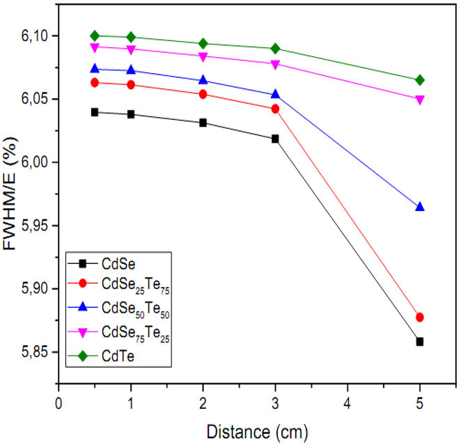 where R is the energy resolution and E 0 is the related energy. The energy resolution of the investigated detectors is displayed in Fig. 9 as a function distance. It can be seen from this figure that the energy resolution of all the said materials decreased with the increasing distance.
