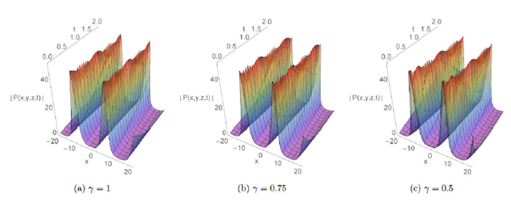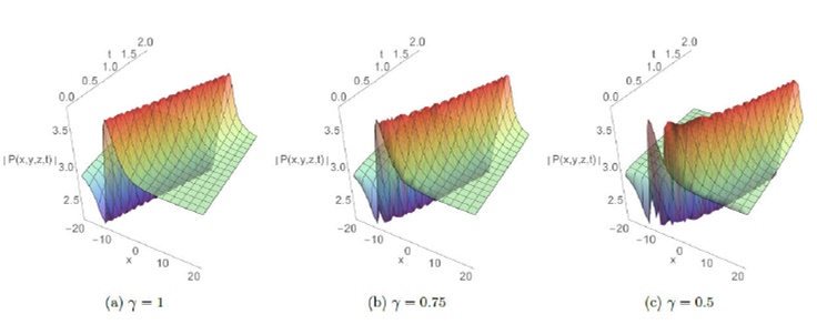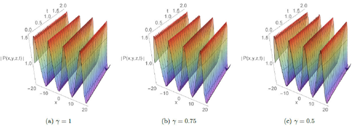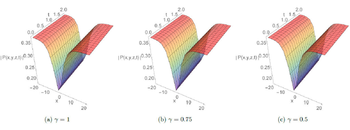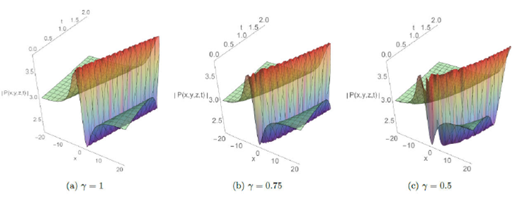 The absolute behavior in 3D plots with integer and fractional order respectively γ=1,γ=0.75, and 0.5 are presented for some solutions in Fig.1-8. These plots reveal different structures such as the dark soliton, multi-soliton, solitary wave, bell-shaped soliton, periodic and kink-type solutions which give the readers a better vision of the behavior of these solutions and captured some physical features of the considered model. Furthermore, Fig.7 and 8 display the effect of adding a new perturbation term on the profile of the solution.