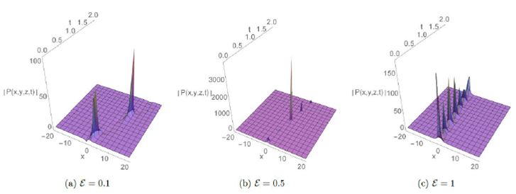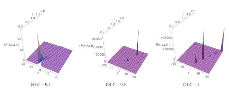 where P represents electrostatic potential, the physical quantities A, B and C are constants. Seadawy et al. 51,52 and Zhen et al. 53 have outlined these physical quantities. The width of the soliton and its velocity deviate from the predictions of this equation when the amplitude of the wave increases. As a result, an additional fifth-order dispersion term which is a higher-order dispersion term, EPxxxxx", is added to (1) to overcome this problem (see 51-54, for more detailed). The new perturbed -(3+1)dimensional ZK equation reads