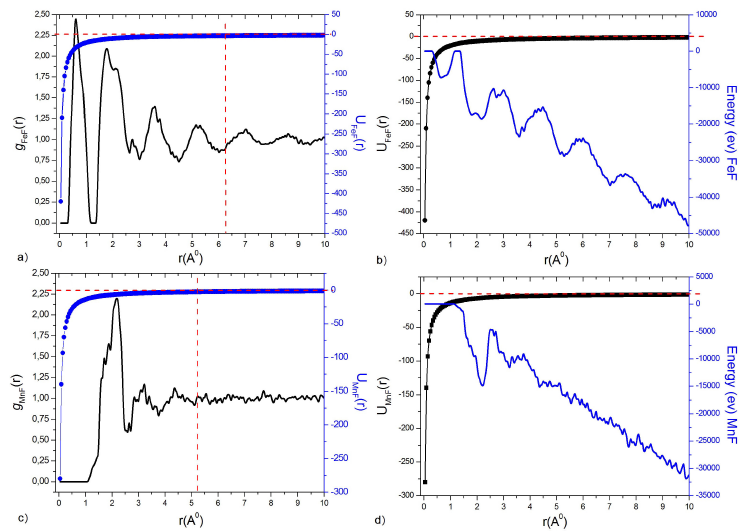 Figure 3 Potential of Buckingham u ij (r), Radial pair distribution function g ij (r) and the total energy E of : a), b) FeF and c), d) MnF at T g = 572 K.