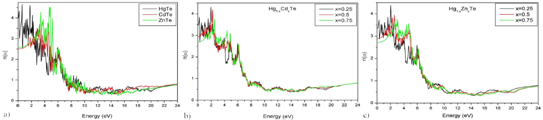 The absorption coefficient α(ω) is related to the extinction coefficient K(ω) (5 and 7) and accounts for the average distance traveled by photons, before being absorbed in the material 35. For the binary alloys, absorption starts from energy values: 1.2 eV [HgTe], 1.85 eV [CdTe] and 2.68 eV [ZnTe]. It reaches maximal values at 6.30 eV [HgTe], 7.13 eV [CdTe] and 4.90 eV [ZnTe]. These results are comparable to those cited in 49. For the ternary alloy Hg 1-x Cd x Te (X=0.25, 0.5 and 0.75), the absorption starts at 1.58 eV, 1.43 eV and 1.77 eV, respectively. It reaches maximum values at 6.60 eV, 6.64 eV and 6.60 eV. In the case of the ternary alloy Hg 1-x Zn x Te (X = 0.25 0.5 and 0.75), the absorption starts at 1.20 eV, 1.85 eV and 2.34 eV, respectively. It becomes maximal at 6.30 eV, 6.68 eV, and 6.75 eV. Extinction coefficient and absorption coefficient spectrum are reported in Fig 10 and 11, respectively. The absorption coefficients relative to the ternary alloy Hg 1-x Cd x Te are found to agree with 15. For alloy, Hg 1-x Cd x Te the absorption coefficient spectrums, as reported in this work, are published for the first time and may constitute data to be compared within future works.
