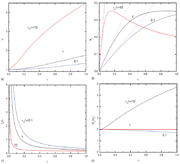 In Fig. 9b) the quantities 4v/3 (black solid line) and (γ-1) χ have been plotted as functions on temperature for 𝑛=1 and four values of the ionization ξ = 10-6 (blue colour), 10-3(red colour), 10-1(brown colour), and 0.99 (green colour).