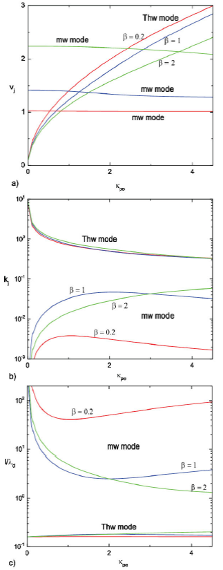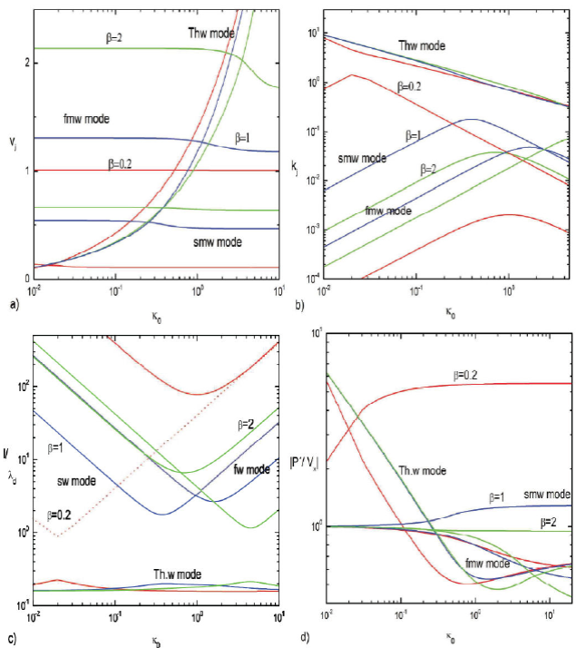 • The case when the only dissipative process taken into account is the thermal conductivity was discussed for several values of θ in Eq. (38). We found eigenvalues corresponding to two damped magnetosonic waves, and a thermal wave. We also found a small jump in the phase velocity for magnetosonic modes for the case of β = 1 which is reflected also in the amplitude.