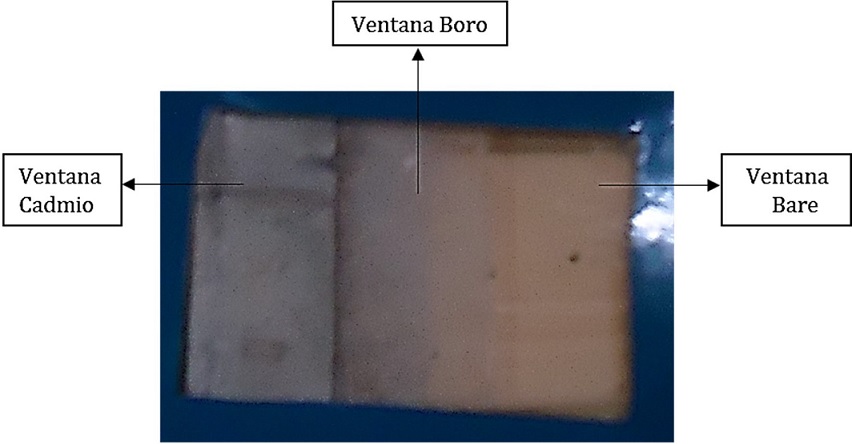Cada CR-39 fue dividido en tres “ventanas” del mismo tamaño: una ventana llamada “Bare” para la detección de neutrones rápidos vía reacción (n,p), otra ventana llamada “Boro” que fue recubierta con un material convertidor de