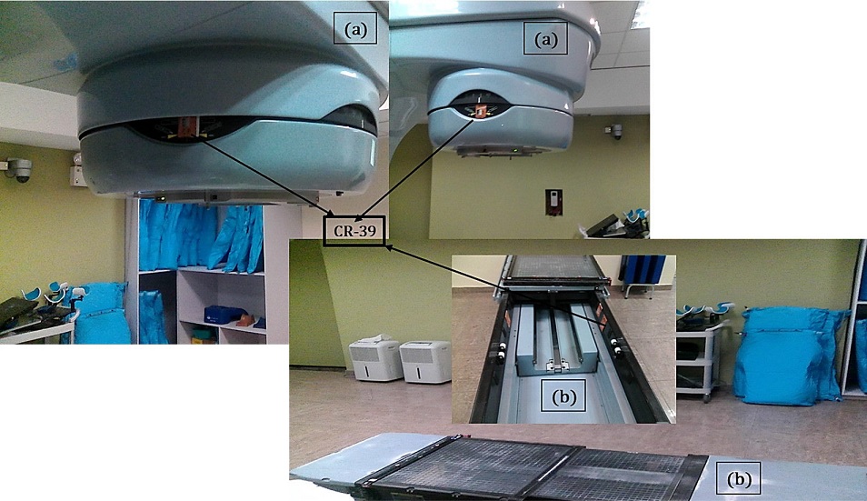 El modelo del acelerador donde se expusieron los detectores es un Varian Clinac 2300 con blanco de W (Tungsteno) y colimadores multiláminas (MLC) de Tungsteno. Este acelerador trabaja en dos modos de energía: 6 MV para electrones y 18 MV para el modo fotones. En total se utilizaron 10 detectores expuestos en cabezal y mesa de tratamiento por un tiempo de 5, 10, 15, 30 y 45 días (tiempo de exposición) mientras este se encontraba en operación para tratar pacientes en modo 18 MV. Los detectores colocados en la superficie lateral externa del cabezal del LINAC estuvieron posicionados a una distancia de 71 cm del blanco, es decir para un diámetro del cabezal de 77 cm el detector fue ubicado a una distancia horizontal de 38.5 cm respecto al eje central del haz terapéutico y a una altura de 60 cm del blanco [Fig. 3a)]. En el caso de los detectores ubicados en la mesa de tratamiento estos fueron posicionados a 110 cm del blanco respecto al eje principal del haz terapéutico. Respecto al IC estos detectores´ estuvieron posicionados a 13 cm de profundidad y a 9 cm de distancia del eje principal del haz terapéutico [Fig. 3b)]. Cabe destacar que dichos detectores estuvieron ubicados en una posición en el que, el cuerpo del paciente se interponía entre el haz terapéutico y los detectores.