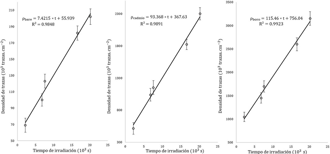 De acuerdo a la Fig. 4, la densidad trazas en la mesa de tratamiento obtenida por los detectores Bare, Cadmio y Boro aumentan linealmente con el tiempo de irradiación. En la Fig. 4a) se observa que para la ventana bare, que son neutrones provenientes de la reacción (n, p) la tasa de densidad de trazas es de 7±1 trazas·cm−2·s−1 mientras que en la ventana Cadmio tiene un valor de 93±5 trazas·cm−2·s−1 que se corresponden a las reacciones (n, α) con convertidor de Cadmio. La mayor tasa de densidad de trazas se observa en la Fig. 4c) que son los provenientes de neutrones térmicos con un valor de 116±7 trazas·cm−2·s−1 y la menor la correspondiente a los neutrones provenientes de la reacción (n, p). De modo que la componente térmica-epitérmica (Boro + Cadmio) predomina con respecto la componente de neutrones rápidos (Bare + Cadmio).