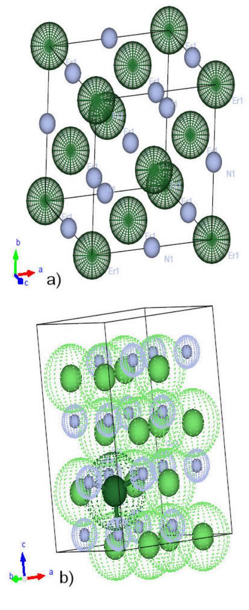 We have investigated the electronic, optical and transport properties of ErN and ErGaN bulk materials shown in Fig. 1, based on DFT [14, 15] using the FP-LAPW method [16, 17] as implemented in the Wien2k code [18]. To calculate the exchange correlation potential, the GGA+U approach wasutilized with a spin-orbit coupling effect, we have used the Hubbard potential U = 8 eV and J = 0 eV for 4f electrons of Er as already reported by Harmon et al. [19], and modified Becke-Jonson approximation (mBJ) [20]. The wurtzite structure of GaN contains 16 atoms, 8 atoms of Ga and 8 atoms of N, one atom of Ga was substituted by one Er atom, to obtain the ErGaN corresponding to a doping concentration 0.125 % of Er. The wave functions are expanded into planes waves in the interstitial region with a cut-off K max = 8 / RMT where RMT has the smallest of all MT sphere radii and K ma is the plane wave cut-off structures ErN and ErGaN we used 2000 and 200 K-points, respectively, in the irreducible Brillouin Zone (IBZ) for our calculation. The BoltzTraP code [21] was used to calculate thermoelectric (TE) properties from ab-initio data using the semi-classical Boltzmann transport theory within the constant relaxation time and rigid band approximations.