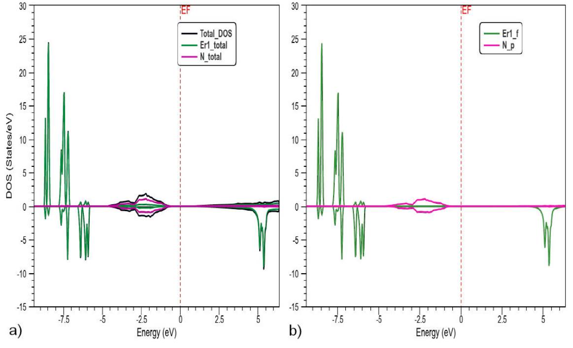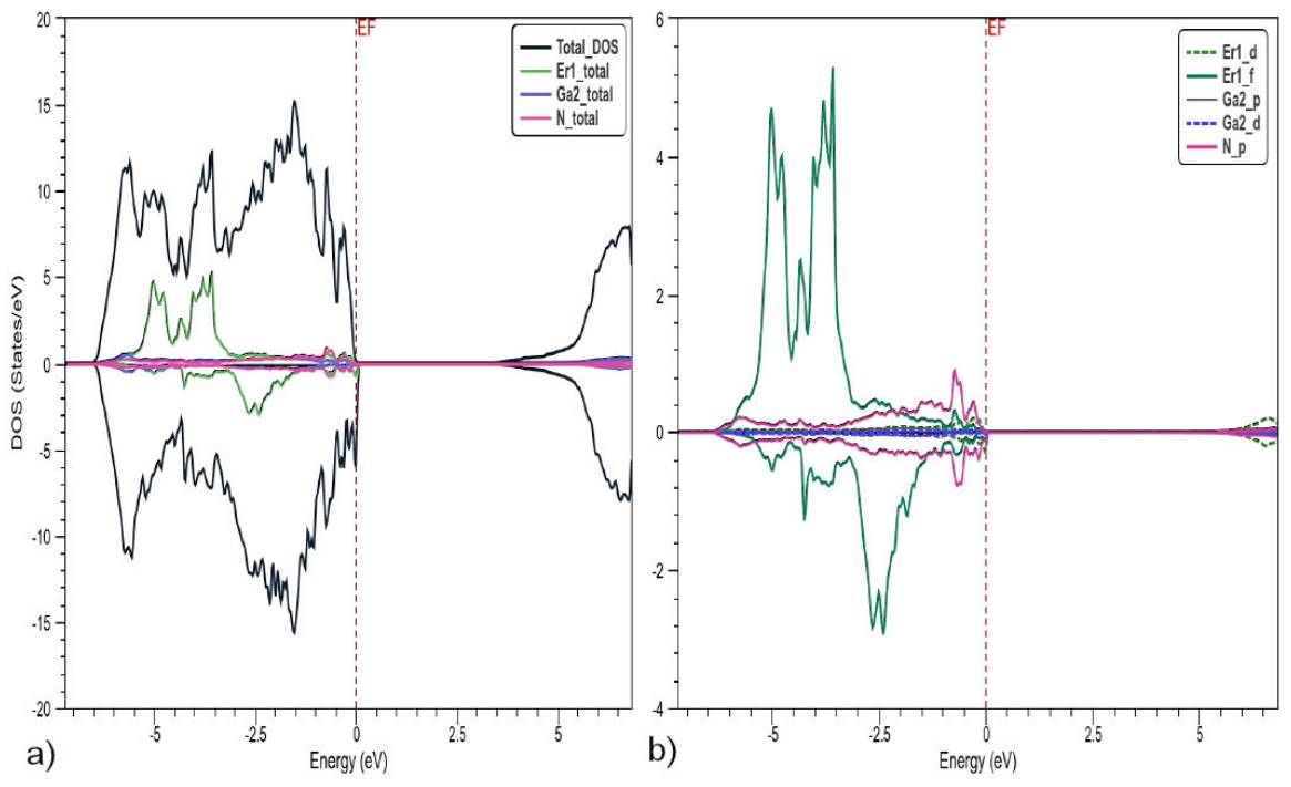 Total and partial spin polarized density of states of ErN are shown in Fig. 4. The valence bands are dominated by the 4f shell of Er states in the region ranging from -9 to -7.5 eV and by the 5p shell of N states from -.35 to -1.5 eV. The bottom of the conduction band is dominated by 4f in range 4.5 to 5.5 eV. For the total DOS, the valence band is dominated by majority spin; in contrast, the conduction band is dominated by minority spin. The DOS of Er0.125 Ga0.875N is shown in Fig. 5, with the 4f shell of Er being dominant and the Ga 4p shell overlapping with the N 5p shell in the valence band. Conversely, the 4p, 5p and 4f shell overlap in the conduction band.