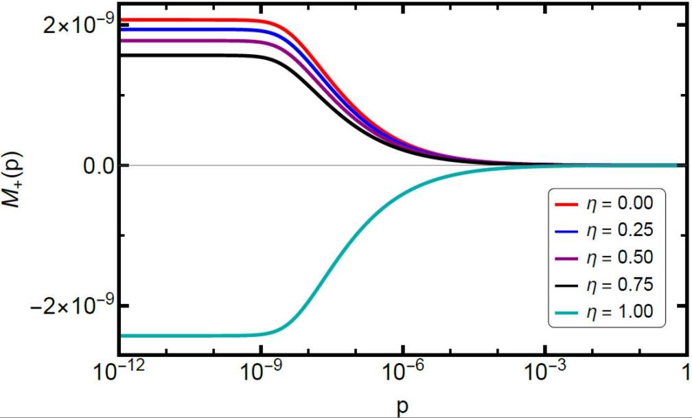 Figure 19 Mass function M+(p) plotted as a function of momentum. The different curves correspond to different values of the CS parameter ϑ = ηϑc with 0 ≤ η ≤ 1 and fixed value of the coupling α = 1.07 αc.
