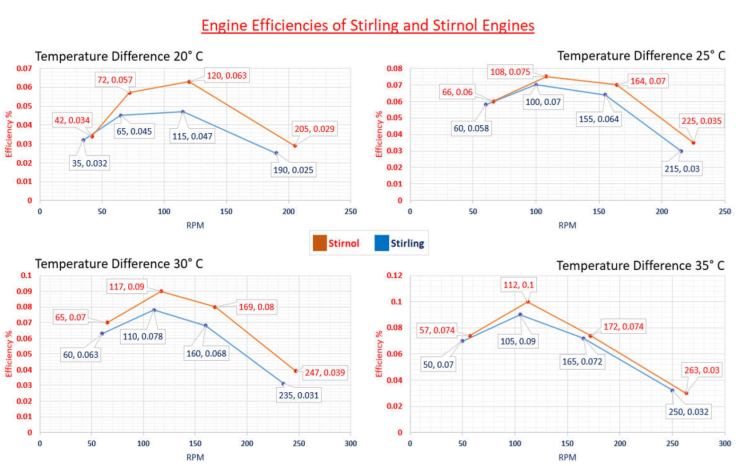 Table V Engine efficiency vs RPM of Stirling and Stirnol engines at various temperature differences.