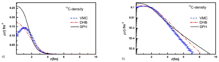 Figure 1 The densities of 10C as a) linear and b) logarithmic scales with errors in the VMC calculations.