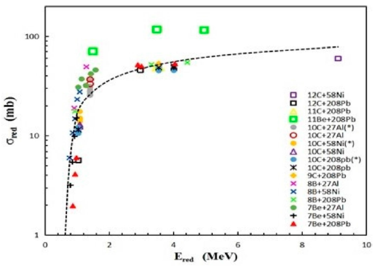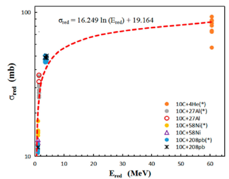 Figure 10 Reduced reaction cross section for several projectiles on (4He, 27Al, 58Ni and 208Pb) targets [21, 39, 40, 49, 51, 63, 65, 67-72]. The general trend of (10C + 4He, 27Al, 58Ni and 208Pb) systems is represented by the dashed line of indicated logarithmic formula. For the systems indicated by asterisk symbol (*), the reaction cross section is obtained in the present work.