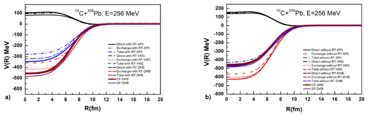 Figure 2 represents the different calculated potentials of 10C + 208Pb system at E tab = 256 MeV. Moreover, the generated real CF potentials for the considered systems: 10C + 4He, 10C + 27Al, 10C + 58Ni and 10C + 208Pb are shown in Fig. 3. As shown in Fig. 2 (upper panel), the real folded potentials employing the CDM3Y6-RT interaction + SPh, DHB, and VMC densities exhibit comparable behavior and considerable variances in depth values in comparison to the SPP and CFP + DHB potentials. This is due to the difference in the direct and exchange terms of real potentials in presence of the RT term. However, as demonstrated in Fig. 2 (lower panel), there are minor variations when CDM3Y6 interaction is used in conjunction with SPP and CFP + DHB potentials. Furthermore, the CDM3Y6/RT + SPh potentials have the shallowest potentials depth and the SPP + DHB potential has the deepest. Mainly, these behaviors are repeated for all the investigated systems at different energies.