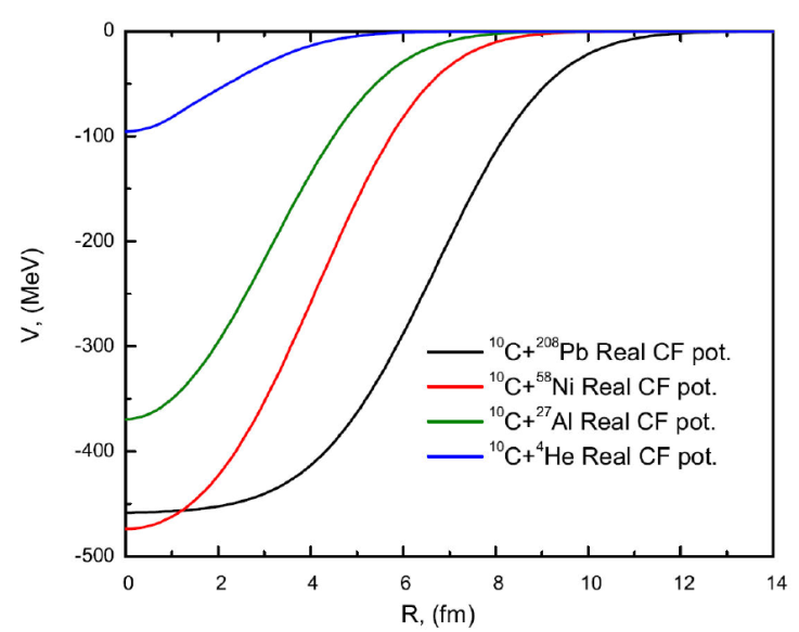 Figure 3 The prepared real CF potentials for 10C + 4He, 10C + 27Al, 10C + 58Ni and 10C+ 208Pb implemented in CFOM calculations.
