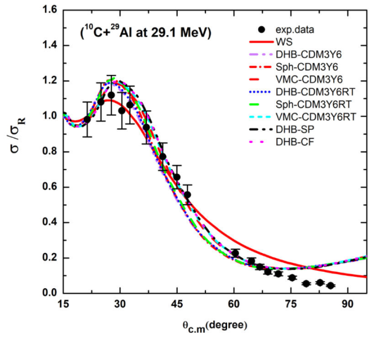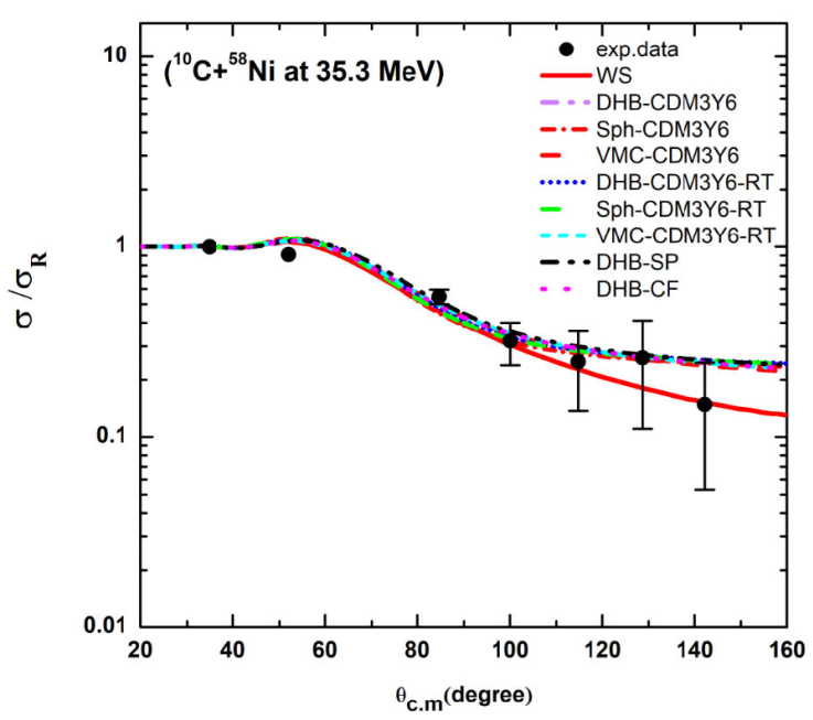 As demonstrated in Figs. 4-9, all of the computed OPs with free one real parameter N R in addition to three imaginary WS free parameters generated almost identical behaviour to experimental data for each reaction at corresponding energy. In terms of 10C densities distributions sensitivity, it is obvious that the N R and W0 parameters may compensate for any of them. Again, the 𝜒2/N values of 4He at 680 MeV and 208Pb at 226 and 256 MeV (far over the barrier) are considerably less than those at lower energies (close to the barrier), indicating strong agreement between the estimated scattering cross sections and experimental data. As an upshot, discrepancy between theory and experiment is found for 27Al, 58Ni and 208Pb at energies 29.1, 35.3 and 66 MeV (close to the barrier), respectively, especially at large angles associated by high 𝜒2/N values. In this context, the same observations have been reported in Refs. [47-51,62,63]. The neglect of transferring nucleon from projectile to the target during the breakdown process might be the cause of the discrepancy, as stated in Ref. [28,64] for 8B+58Ni at energy range 20.7-29.3 MeV. It is worth mentioning that all the considered systems are reanalyzed at energies well above the Coulomb barrier. The interaction dynamics may greatly differ as the bombarding energies become close to and below the Coulomb barrier. Our forthcoming work will discuss the peculiarities of interaction at lower energies (close to the Coulomb barrier energy) as well as observe the transfer, breakup, and other mechanisms which could affect the reaction channels.