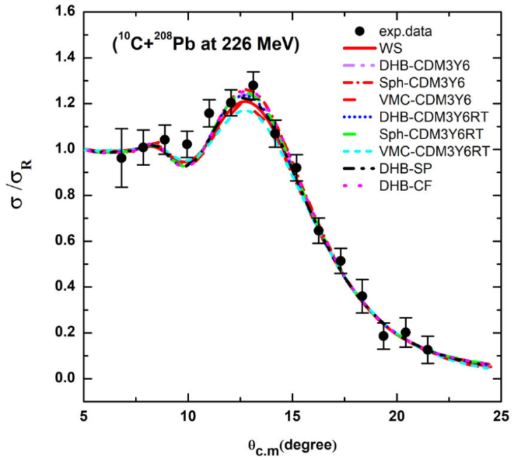 The semi-microscopic potential of Eq. (3) is used to calculate the impact of the density distribution in conjunction with the considered NN effective interactions. The real part of the potential is calculated using the CDM3Y6 and CDM3Y6-RT effective NN interactions folded with SPh, DHB and VMC densities, as well as SP and CFP folded with DHB density within REGINA code [22]. Hence, eight microscopic real potentials are obtained according to the different (interaction potential + densities) combinations, namely, CDM3Y6 + DHB, CDM3Y6-RT + DHB, SPP + DHB, CDM3Y6 + SPh, CDM3Y6-RT + SPh, CDM3Y6 + VMC, CDM3Y6-RT + VMC, and CFP + DHB, which are implemented in the calculations. This folding technique is distinguished by an adjustable parameter N R , which is the renormalization factor for the implemented real microscopic DF potential. This factor is allowed to be freely changed till the best agreement between experimental data and theoretical calculations is reached through minimizing the 𝜒2 values. The created real microscopic potentials are then multiplied by the N R factor, hence increasing or decreasing the prepared potentials’ strength. Then, and by using an appropriate search code such as SFRESCO [56] and HIOPTM-94 [61], we could get the optimal N R value. Of course, as the value of this factor (N R ) is close to unity, it means that the used potential is non-renormalized.