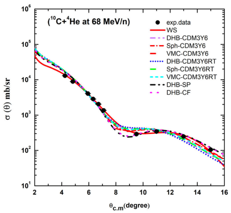 1. For 10C + 4He system, the considered data is at E(10C) = 680 MeV. So, the required potentials are 9B + 4He at E=9/10×680=612 MeV and p + 4He at E=1/10×680=68 MeV. As there is no experimental data for the 9B + 4He channel, the 9B + 4He potential is prepared using the SPP within the framework of REGINA code. The inherited density distributions for 10C and 4He in this code were implemented, and the renormalization factor for the real SPP (NRSPP) was taken by default 1.0. On the other side, the p + 4He potential at E = 55 MeV [57] was utilized, as it is the closest existed data to p + 4He at E = 68 MeV found in literature.