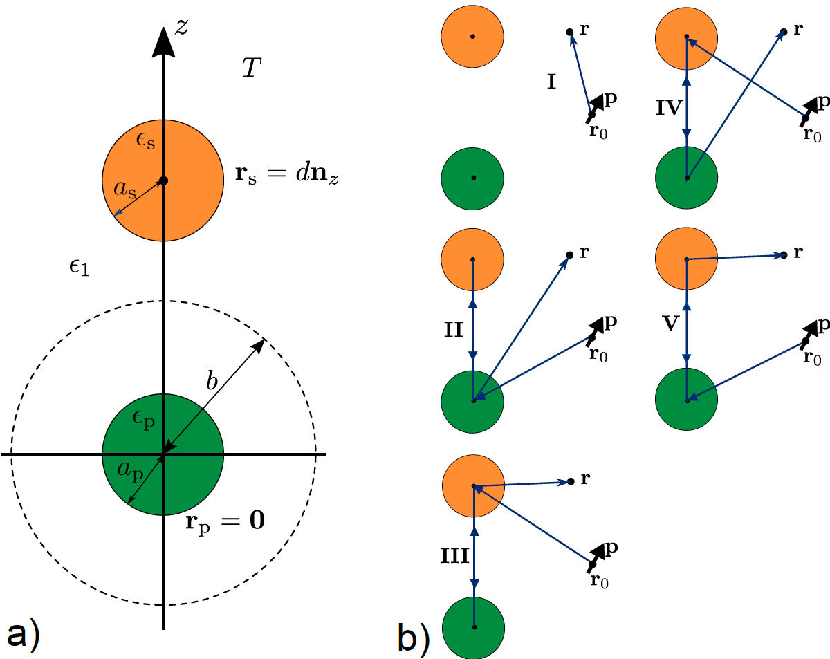 To calculate the van der Waals force due to vacuum and thermal fluctuations that is exerted on any of these particles, we require the electric response of an arbitrary electric dipole located at the background medium in presence of the two particles; as will be seen, the electromagnetic field correlations of vacuum and thermal fluctuations are needed for obtaining the force and they depend on this response. Then, the electric response is expressed as