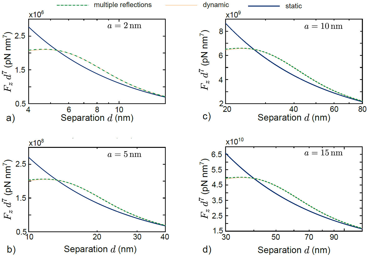 In the atomic case, the polarizability of each of the atoms is described by a single resonance. The effect of multiple reflections changes with respect to the van der Waals force law d-7; the force difference between these curves at equilibrium separation (