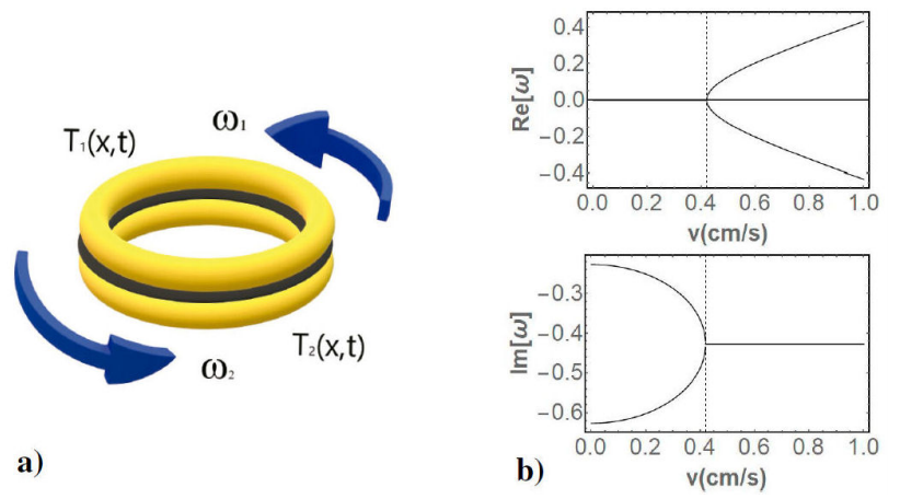 Figure 1 The figure a) shows two identical rotating rings with equal but opposite angular velocities joined together by a stationary intermediate layer and b) the imaginary and real parts of the eigenfrequencies as a function of the tangential velocity where the dotted line represents the exceptional point vEP=hc/κ.