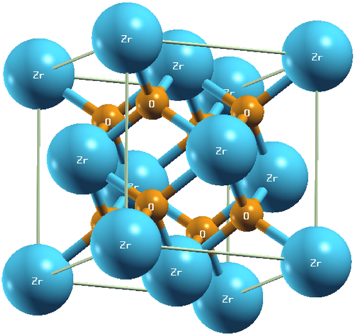 ZrO2 has a cubic crystalline unit cell structure belonging to the space group number 216 Fm3m from the X-Ray Crystallography international table, with a lattice parameter of 5.09Å [18]. The inter-sites defects are represented by empty spheres Z=0. The atoms’ positions are 4a Wyckoff (0,0,0) for zirconium and 8c Wyckoff (1/4,1/4,1/4) and (3/4, 3/4,3/4) for the oxygen atoms. The zirconium oxide unit cell is presented in Fig. 1. The dislocated defects of Iridium are incorporated into the host material by atom change doping where Ir atoms replace Zr ones.
