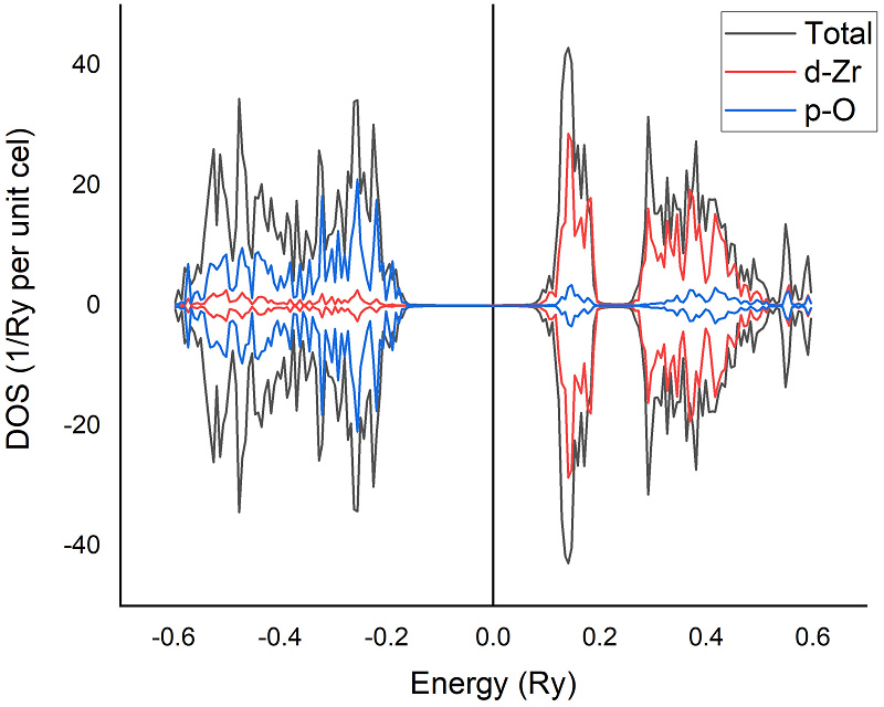 The total and partial density of states of pure zirconium oxide shown in Fig. 2 indicate a non-magnetic material due to the symmetry between minority and majority spins in up and down states of orbitals in both valence and conduction bands [23]. This is confirmed by a zero magnetic moment computed for this material. A notable underestimation of the band gap value found (about 3.01 eV) compared to the experimental results of 5.7eV [24], is due to the overestimation of the interaction energy by the DFT method [25]. This can be observed in the figure where the valence band has a large width, with a main contribution of the oxygen p orbital while the zirconium d orbitals are mainly located at the conduction band. It was previously demonstrated that defects induce states in the band gap where its locations concerning the valence band maximum conduction band minimum can help predict the contribution of the dislocated atoms and their different magnetic aspects [26, 27].