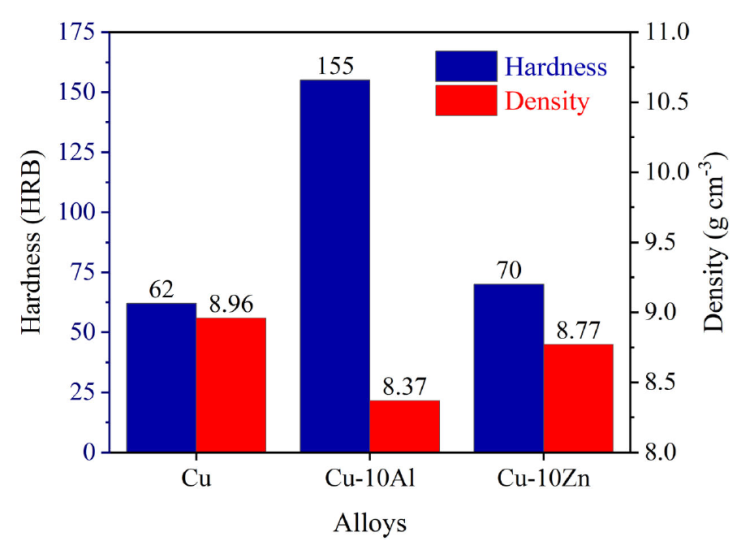 The effects of Al and Zn content by 10 wt% each on the physical and mechanical properties of Cu, alloy experimental results are exposed in the following two charts. Figure 1 shows the physical properties of the alloys related to hardness and density at peak aged conditions. It is observable from the figure that, at peak aged conditions, both Cu-10Al and Cu-10Zn have higher hardness values than pure Cu. As solution strengthening occurs through the dissolved Zn and Al atoms in the alloys. As a result, α-brass and Al-bronze have higher hardness compared to Cu [15,16]. Again, Al-bronze has superior hardness to Zn-bearing α-brass. During age hardening, five stable intermetallics of Al and Cu are formed: Cu9Al4, Cu3Al2, Cu4Al3, CuAl and CuAl2. Among them, two specials are Cu9Al4 and Cu3Al2, which cause higher hardness in the Cu-10Al alloy [17,18]. These stable intermetallic phases have been identified in Cu-Al alloys in several previous investigations [19-21]. When the concentration of Zn is below 35 wt.%, the phase of brass is α, which has a substitutional and disordered face-centred-cubic (fcc) structure. As aresult, Cu-10Zn shows a single fcc state of α-phase with no discernible age-hardening effects, which makes Cu-10Zn alloy softer than Cu-10Al [22, 23]. Additionally, in Fig. 1 depicts the variation of density among the experimental alloys. Pure copper has the highest density, whereas Al-bronze is the lightest, as the densities of Cu, Zn, and Al follow this sequence: Cu>Zn>Al. It can be seen from Table I. that Al and Zn are present in the alloys by 10 wt.%.