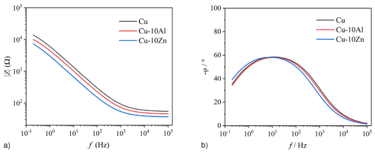 From the equation, it is known that at high frequency, the right term of the equation gets close to zero, and the impedance is close to the solution resistance. Figure 5a) shows a similar trend. The Bode magnitude plot for pure Cu is situated higher than Al-bronze, where the curve for α-brass lies lower than the alloy with a higher amount of Al, which can be explained by Eq. (6) and Table II. From the table, both R S and R p are higher in Al-bronze than α-brass, the pure Cu having the maximum value. For higher values of R S and R p , the impedance must be higher, according to Eq. (5). In Fig. 5b), no phase shift is there at lower and higher frequencies, indicating a resistive response. On the other hand, at mid-range frequencies, the phase shifts are closer to -90, which is a capacitive response.