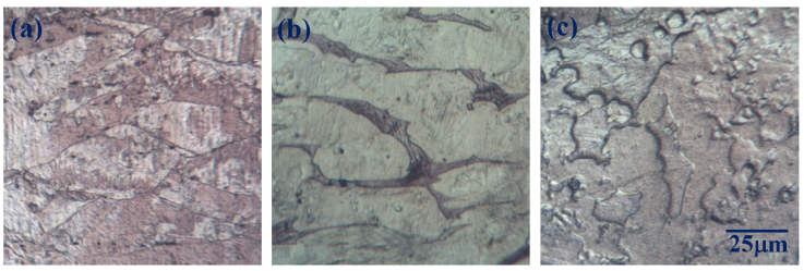 The conventional optical microstructures of the etched pure Cu, Al and Zn added Cu alloys are shown in Fig. 8, after cold rolling and peak aged conditions. Due to rolling by 40% deformation, elongated and broken grains are formed in the direction of rolling. The grains become elongated in the direction of the applied stress, irreversibly changing the microstructure during cold working. The distribution of the size of the Cu grains is not uniform, and there are some smaller grains visible in the middle of the coarse grains, where several twins also exist within the grains [Fig.8a)] [46]. Different phases such as α-phase, several κ-phases, and retained β' phase are there in Al-bronze. The specific phases also refine the grain structure [47]. Cu-Zn alloy shows a single-phase fcc condition because the level of Zn content is below 35 wt.%. The single-phase brass is formed when Zn is melted into Cu and develops a uniform crystal structure, revealed by the Cu-10Zn alloy’s resultant microstructures [Fig. 8c)]. Similar observations are also made by the earlier investigators [48].