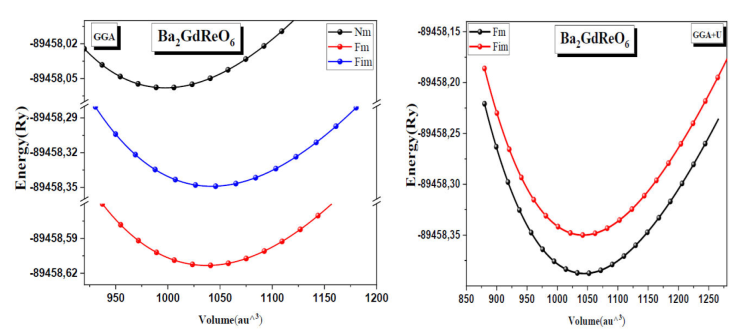The objective of this section is to find the adequate stable state of the compound Ba2GdReO6. Calculations of the total energies for different volumes were performed using the GGA and GGA+U approximations, following three configurations: the Ferromagnetic (FM), Non-magnetic (NM) and Ferrimagnetic (FiM) configuration. Two configurations were considered when using the GGA+U method: Ferromagnetic (FM) and Ferrimagnetic (FiM). The results obtained by plotting the curves in Fig. 2.