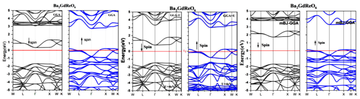 The electronic band structures calculated for the Ba2GdReO6 material at the equilibrium lattice constant are shown in Fig. 3.