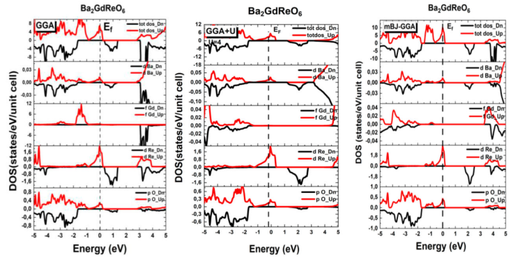 In order to delve into the interpretation of the band structure curves, we have plotted the PDOS and the TDOS densities of states for the double Perovskite Ba2GdReO6, following the approaches using the GGA, the mBJ-GGA and the GGA+U approximations, which are illustrated in Fig. 5. The Fermi level (EF) being represented by a vertical dotted line (0 eV). At first glance, from the calculations carried out according to the three approximations: GGA, GGA+U (U = 4 eV), mBJ-GGA and materialized by the curves illustrated in Fig. 5, it is noted that the latter presents a similar aspect as to the shape of the peaks and by the obvious anti symmetric between those of the spin up and those of the spin down with a shift of the peaks different from one approximation to another along with a bursting of the energy bands.The main distinction between the three approximations comes from the fact that the TB-mBJ-GGA approximation estimates a more accurate value of the gap in the spin down channel compared to the other two approximations (GGA and GGA+U).