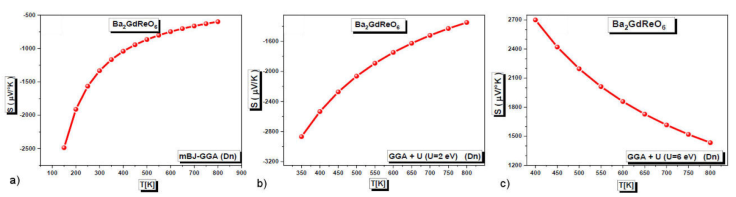 Figure 6 Variation of Seebeck coefficient S as a function of temperature for Ba2GdReO6: a) using mBJ- GGA approximation, b) using GGA+U (U=2eV) approximation and c) using GGA+U (U=6 eV) approximation.
