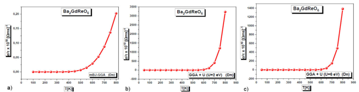 Figure 7 Variation of the electrical conductivity per relaxation time (σ/τ) as a function of temperature for Ba2GdReO6: a) using mBJ- GGA approximation, b) using GGA+U (U = 2 eV) approximation and c) using GGA+U (U = 6 eV) approximation.