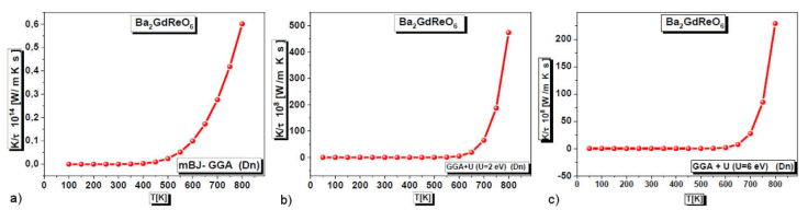 Figure 8 Variation of the electronic thermal conductivity per relaxation time (ke/τ) as a function of temperature for Ba2GdReO6: a) using mBJ- GGA approximation, b) using GGA+U (U = 2 eV) approximation and c) using GGA+U (U = 6 eV) approximation.