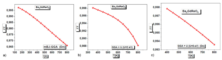 where T the absolute temperature, S the Seebeck coefficient, σ the electrical conductivity and K the thermal conductivity. In order to optimize the transport properties of a material, the figure of merit ZT must be as high as possible (close to or greater than unity), which implies that the Seebeck coefficient S and the electrical conductivity must be as large as possible while the thermal conductivity must be minimized without affecting the electronic transport of charges. Figure 9 shows the plot of the merit factor ZT as a function of the temperature T, by the evolution of these curves, the merit factor ZT decreases with the temperature, going from a maximum value of 0.99 (150 K) to a minimum value of 0.96 (800 K) for the mBJ-GGA approximation, with respect to the approximation GGA+U (U = 2 eV), it goes from 0.99 (350 K) up to the value of 0.98 (800 K) while for the approximation GGA+U (U = 6 eV), it decreases from 0.997 (400 K) to 0.993 (800 K). However, this decrease does not imply a significant degradation of the merit factor ZT, because it keeps very suitable values (close to unit) and therefore very interesting for thermoelectric applications. At room temperature (300 K) the value of figure of merit ZT is 0.991 for the mBJ-GGA approximation. Due to the fairly substantial value of the figure of merit ZT, the double perovskite material Ba2GdReO6 has excellent predisposition in the thermoelectric field.