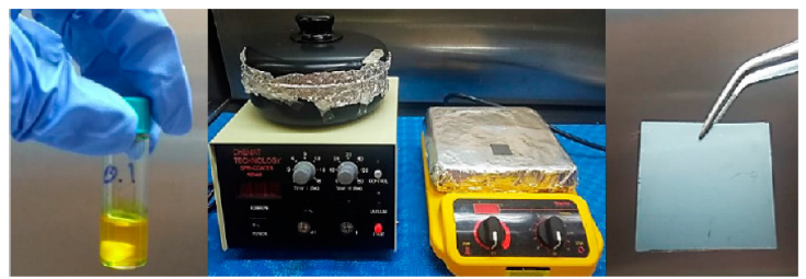 In this section, the results for representative samples arepresented. In Fig. 1, we can see the elaboration process, the yellow solution containing precursors was deposed in one step on the substrate previously heated. After 2 minutes of sintherization a gray color thin film of hybrid perovskite was obtained.