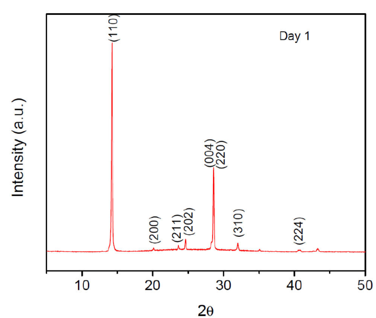 The stability of thin films of CH3NH3Pb0.9Sn0.1I2.5Cl0.2 and CH3NH3Pb0.75Sn0.25I2.5Cl0.5 hybrid perovskites were monitored through XRD and absorbance measurements. Meanwhile, thin films were kept in a Petri dish under environmental conditions. The stable phase of CH3NH3PbI3 normally displays eight diffraction peaks: (110), (200), (211), (202), (004), (220), (310) and (224) corresponding to a tetragonal symmetry [1, 12, 30-33], as we see in Fig. 2.