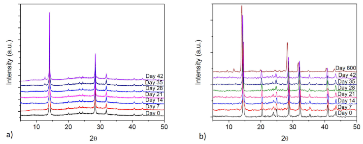 Figure 3 DRX of a) sample of doped perovskite CH3NH3Pb0.9Sn0.1I2.8Cl0.2, no degradation peak is present until 35 days, b) doped perovskite CH3NH3Pb0.75Sn0.25I2.5Cl0.5, showing the degradation peak after 600 days.